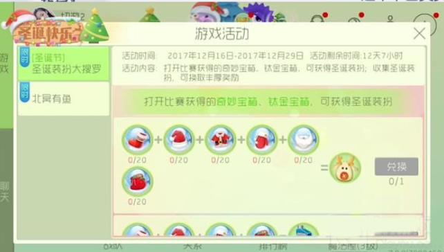 活动内容:打开比赛获得的奇妙宝箱、钛金宝箱,可获得圣诞装扮;收集圣诞装扮,可换取丰厚奖励。