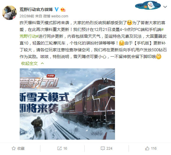 由于【手机版】更新补丁较大,请各位玩家注意检查存储空间,我们将在更新后向手机用户发放500钻石作为奖励。咳咳,特别说明,雪天蹲点可要小心,一不留神就会留下脚印哦