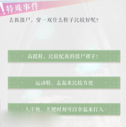 3、去抓僵尸,穿一双什么样鞋子比较好呢?【答案:运动鞋,跑起来比较方便】