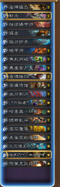 环境中如果慢速卡组较多,可以考虑把枯须铸甲师换成金闪闪或伊瑟拉或亡者之牌。