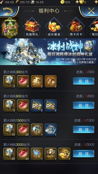 累计消耗300金币:冰封战神礼盒*2、神兽食物*5、木材50万*2、粮草50万*2。