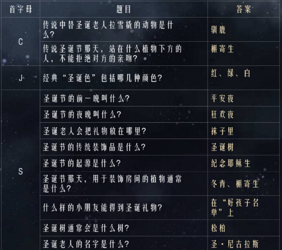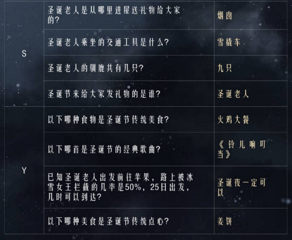 以上就是西西小编为大家带来的奇迹暖暖圣夜奇缘答题答案,圣夜奇缘答题答案大全。希望大家喜欢。
