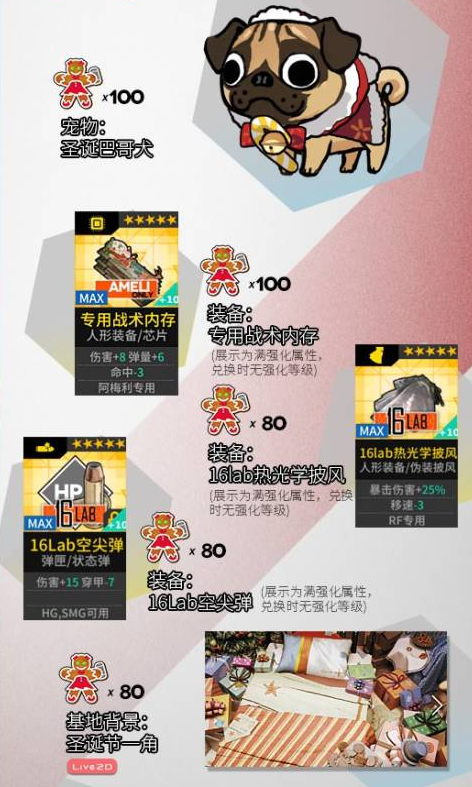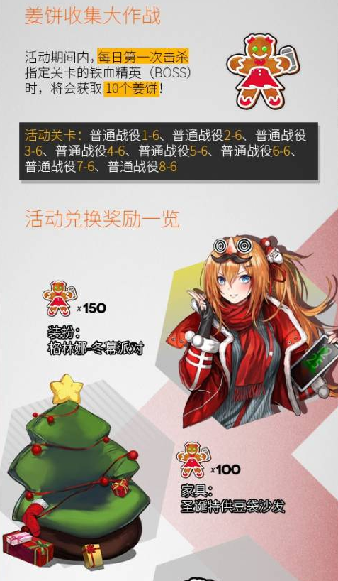 圣诞限定活动“姜饼收集大作战”将要开始啦!12月21日维护后~1月11日23:59期间,每日第一次击杀指定关卡的铁血精英(BOSS)时,将会获取10个姜饼!