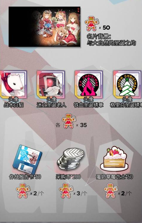 姜饼可以在活动商城兑换丰富奖励,包括格琳娜圣诞装扮“冬幕派对”、圣诞特别家具、阿梅丽专属装备和大量采购币!还有圣诞名片背景、圣诞live2d基地背景、各式圣诞头像和礼物可以换取!