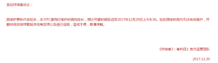 因维护更新内容较多,本次例行维护时间将延长,预计开服时间延迟至2017年12月20日上午10:00。如在预定时间内无法完成维护,开服时间将继续顺延并将有后续公告进行说明,造成不便,敬请谅解。