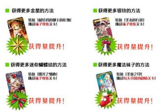 可分别提升活动道具「金星」「银铃」「迷你蝴蝶结」「魔法袜子」的掉落获得数量。