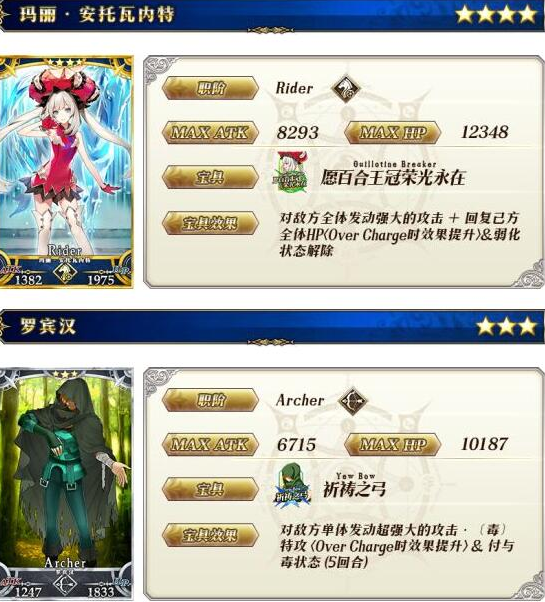 并且,「★4 (SR) 童谣」「★4 (SR) 玛丽·安托瓦内特(Rider)」「★3 (R) 罗宾汉」「★3 (R) 荆轲」也将推荐召唤!