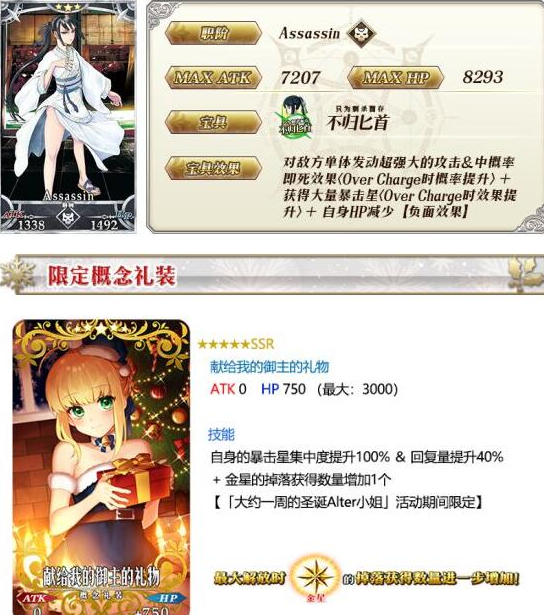 ※和2016年开放过的「大约一周的圣诞Alter小姐」相同,本次活动中,可以获得限定从者「★4(SR)阿尔托莉雅·潘德拉贡〔圣诞Alter〕」以及活动限定概念礼装。