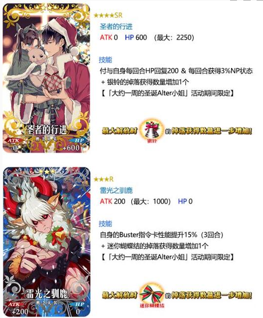 通过装备限时概念礼装「★5(SSR) 献给我的御主的礼物」「★4(SR) 圣者的行进」「★3(R) 雷光之驯鹿」可提升活动道具的掉落获得数量。