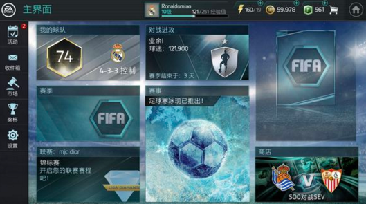 直播赛事(EA的活动都在这,都需要消耗体力,每天必做任务,铜卡、银卡、金卡。精英卡都可能出,看人品,当然我是非洲来的花几千了,没见过84以上红卡)
