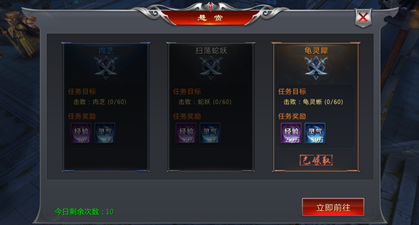 悬赏:玩家最早领到的高经验任务,每天可以接取10次。一定要尽可能的升到橙色任务(橙色任务经验是紫色的4倍),完成后再选择花费20绑元双倍领取,前期送的绑元还是挺多的不要心疼。