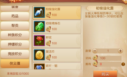 新手期侠义值优先兑换装备强化石和精炼石材料,这两个对职业战力提高有帮助,不过一周你只能兑换到10个物品,注意材料上的分配,看副本中那种材料掉落的少可以选择兑换那种材料。