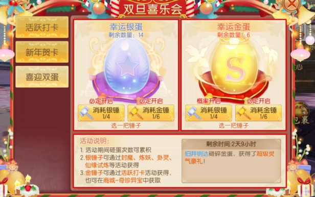 如何砸蛋:可通过各种活动获得金锤子、银锤子,金锤子100%可砸开金蛋、银蛋,银锤子100%可砸开银蛋、一定几率可砸开金蛋。