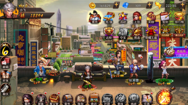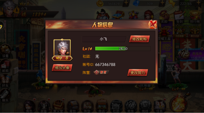 主界面左上角展示角色名称、等级、战斗力以及VIP等级;点头像会弹出人物具体信息,可在此看到等级经验条,修改昵称以及头像、社团、账号ID,更改势力阵营;