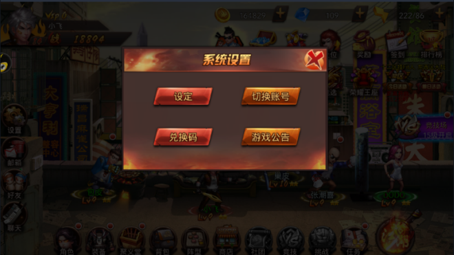 点击界面左下方设置的按钮可弹出系统设置,可在此关闭或开启音乐音效及推送、兑换礼包、切换账号、查看游戏公告;