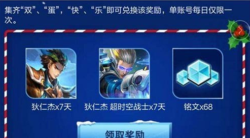 收集到:双蛋快乐,四个字之后,可以在下方兑换狄仁杰7天体验卡+狄仁杰超时空战士7天体验卡。