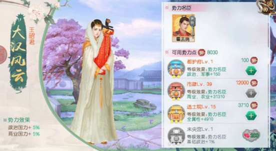 ⑦妃子势力,妃子都有势力名臣,也有势力效果,还有势力点可以升级。势力点不要随便加,最好加在欠缺的那个属性上。