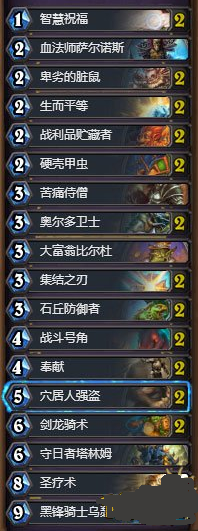对局优劣:在遇到比较后期的卡组时候,是占了一定的优势的。因为有斩杀嘛,所以目前很流行的肉块术,以及什么走A牧等等,都是能7/3开的。我这样说也是有根据的,因为骑士从不缺少软解,超管,城管还有314的发现,都能帮助骑士获得回合数,而拖下去拿到一套就能直接带走。脏鼠如果在手上可以留个走A牧的维纶,一定要算准牌库,拉维纶是最值得的。