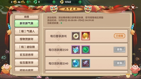 每日登录送玄玉*10、大富翁积分2000,活跃度20送灵石、青玉髓,活跃度40送宝石精华、1级他山之石,活跃度60福佑仙丹、灵石,活跃度80送灵石*2、舞王秘籍,每日活跃度100送鸡星魄、宝石精华*2。