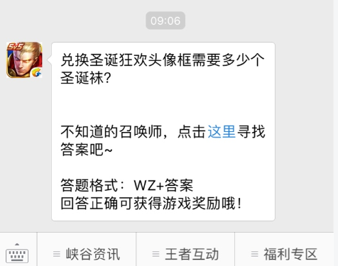 王者荣耀微信公众号有小额福利哦,玩家回答每日一题可以获得不错的奖励,不少玩家都在参与,今天的题目是兑换圣诞狂欢头像框需要多少个圣诞袜,西西小编来为大家介绍。