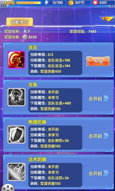 军团技能:优先去点经验、其次去点暴击、闪避、命中、抗爆,最后有余力再点攻击防御生命这些。
