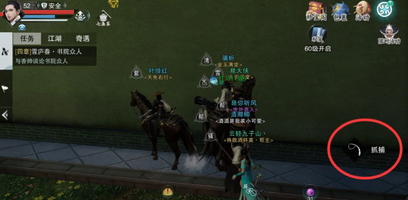 等大侠赶到时那是一个人山人海,赶紧跑到一匹背上没人的马身边,会出现红圈内的抓捕按钮,就看谁的手快了,每次抓捕失败后马儿会跑开一段距离,大家记得紧跟上。很可惜,大侠不是幸运儿,没抓到过马~至于传说中的稀有白马那更是无缘得见。