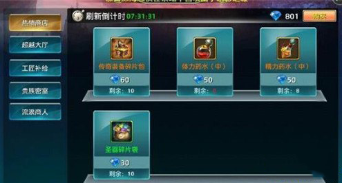 2、热销商店,在头像下方一点点的位置可以查看到,在这里可以购买到中等品质的体力药水和精力药水,50钻石一瓶,但是也和VIP现在有关,VIP0只可以购买一次