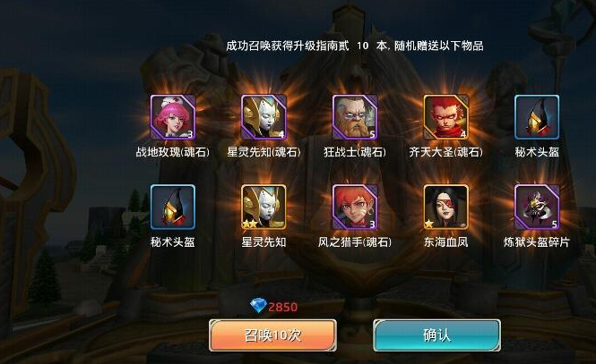 1.召唤,这是最容易获取英雄的地方,而且钻石10连抽更加可以获取到整个英雄,而不是魂石,但是在召唤获取中,有一个缺点就是不能获取到指定的英雄,只能随机获取,所以对于钻石不多的玩家,是不推荐的