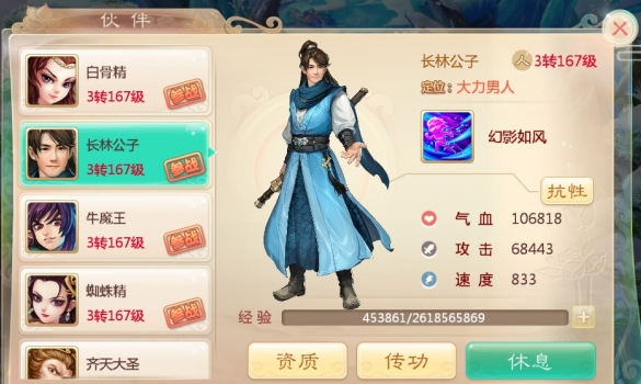 实验所采取阵型,主要依托长林公子引导任务所展示的黄金阵容,牛魔王、蜘蛛精、白骨精、长林公子,全部为3转167级,跟人物等级走。