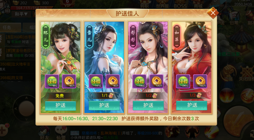 作为每日必做的获取经验的重要途径之一,护送佳人每天有三次双倍护送经验时段,分别为16:00-16:30和21:30-22:30,建议玩家选择双倍经验时段完成任务以提高收益。