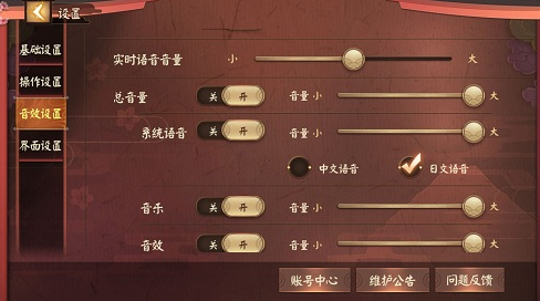 1、游戏设置:看看是不是游戏设置的问题,这里我们打开游戏里面的设置,然后【音效设置】,这里看看有没有都开起来,有时候我自己关了就忘记开了,可以看看有没有开,还可以选择中文语音和日文语音。
