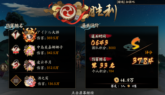 战斗胜利S评分,3输出1奶1辉夜姬常规阵容即可。