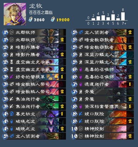 梦里人(4级),这个就是黄金赛里还存在揭法龙牧,基本前期能站住就不会输,可以完克走A怪。不过依旧还是惧怕前期能快膨胀场面的卡组,例如快攻德,一旦逃离3血的AOE范围,就很危险了。所以前期一定要不惜一切代价都要站住场,之后644上场就稳了。