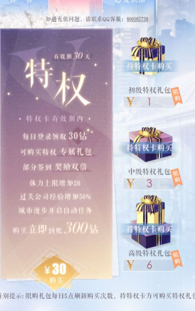 30RMB,购买理会获得300钻石,还有签到双倍,专属礼包,体力上限增加,过关公司经验增加等等奖励