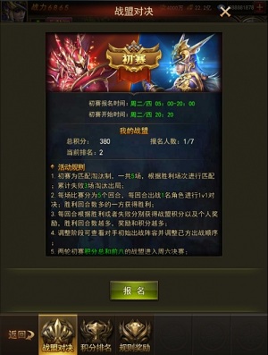 初赛就是五场淘汰赛,我们会进行对决,如果失败3场的就是失败,会被淘汰出局,胜利的就进行下面的比赛,我们可以出战5个人,也就是我们五个人都是进行1v1,而且我们只能出战一个角色,这些出战的顺序是有盟主来决定的,战盟里的每个成员都可以报名进行初赛。