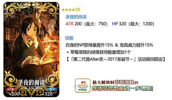 装备礼装-圣夜的阅读,可以提高草莓蛋糕的掉落数量