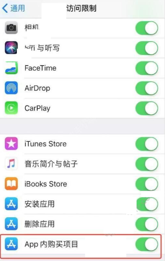 (4)在iphone7以上收集出现支付不成功的情况时,请更改手机设置的“访问限制”,打开IAP支付即可(App内购买项目-打开)。
