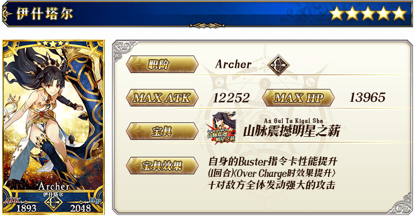 伊修塔尔,又称弓凛,五星弓阶光炮从者。极快的NP积攒速度,优秀的输出技能,弓阶的集星能力和暴击威力提升,光炮副效果爆炸,优秀的卡面,非常值得抽。