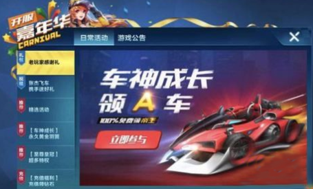参与游戏内老玩家感谢礼活动--车神成长领A车,累计登录提升自己的能力,可以免费获得A车帝王。