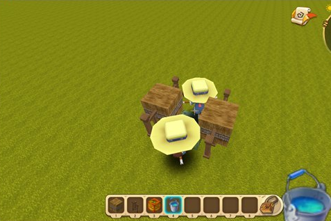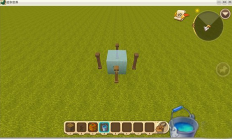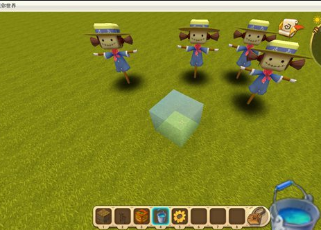 到这一步所有的木围栏和草垛就变成了4个稻草人,然后中间那桶水却固定在远处没有动哦!一个静态水方块就做好了!