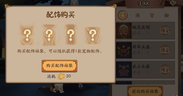 2、消耗20个萌爪钱币就能随机获得1款宠物配饰和少量金币、勾玉等道具奖励。