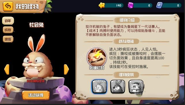 社会兔的造型如上图所示,技能是死缠烂打,可以增加撕咬时的移动速度。