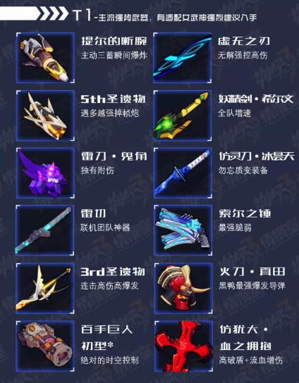 T1武器强度以及泛用性很高,无论是在联机深渊战场,还是刷图清日常,都非常出色,对老玩家或者萌新都有很大的提升。