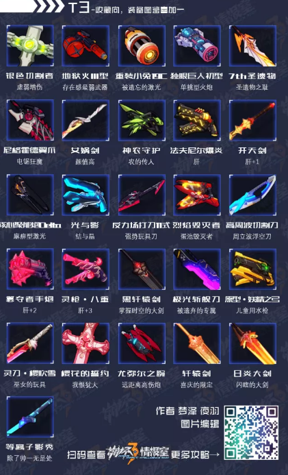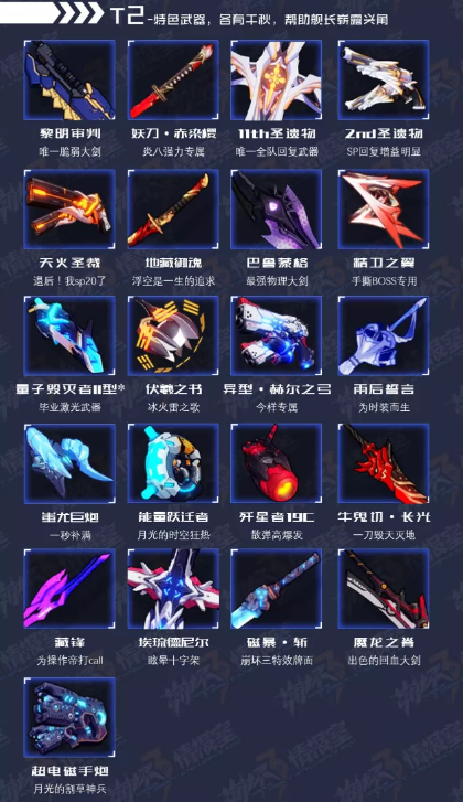 T3武器强度较差,适用面很狭窄,收藏向,玩具向较多。大多可作为结晶来供养前几阶层的武器。