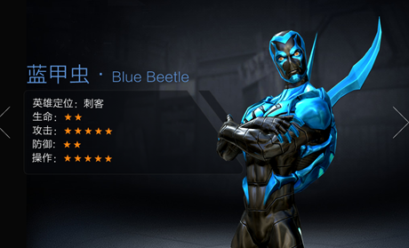 蓝甲虫这个英雄定位和他的外形格外契合,在《正义联盟:超级英雄》游戏中是一个物理近战型刺客,擅长突进、收割向的技能;