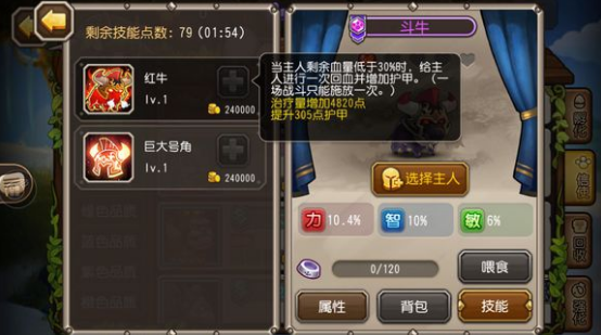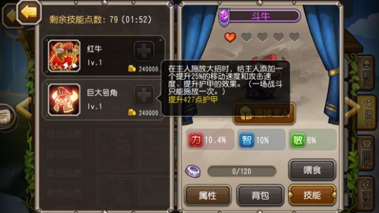红牛,当主人剩余血量低于30%时,给主人进行一次回血并增加护甲。