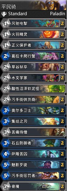 污手骑不是一个特别强的卡组,尽管骑士别的卡都还行,但是它们都需要传说卡和史诗卡,即使作为一个平民卡组来说,污手骑也很弱,除非你就是想玩这个职业,又没有尘,否则尽量考虑别的卡组。