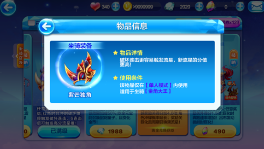而在装备了紫芒独角之后,这款坐骑不仅破坏连击更容易触发流星,而且新流星的分值更高哦。不管是从哪个方面来说,这款坐骑的这些特性都是非常不错的,因为金角大王本来就是走的破坏流的分数路线, 而高分流星雨则是它的主要得分来源,