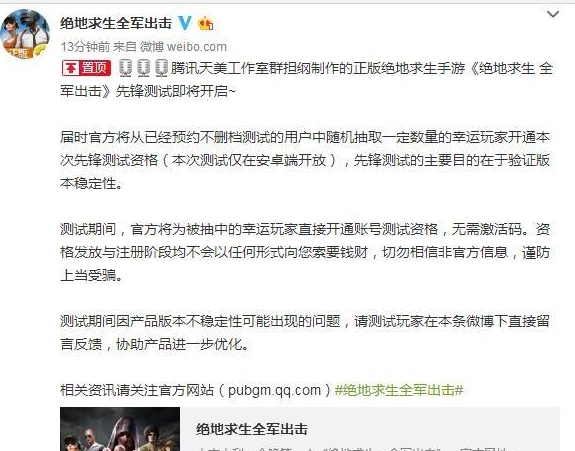 绝地求生全军出击这款游戏最近在官方微博宣布游戏即将开测,官方会在预约玩家们随机抽取,相信很多的玩家都会期待,但是苹果机玩家暂时无法参与,下面西西就为大家带来详情介绍,希望大家喜欢。