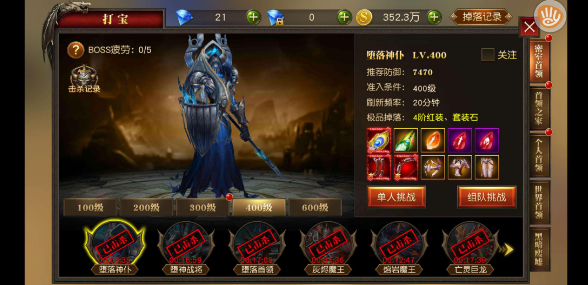 点击打开打宝界面,可以看到有密室首领、首领之家、个人首领、世界首领、黑暗废墟 五个块面!